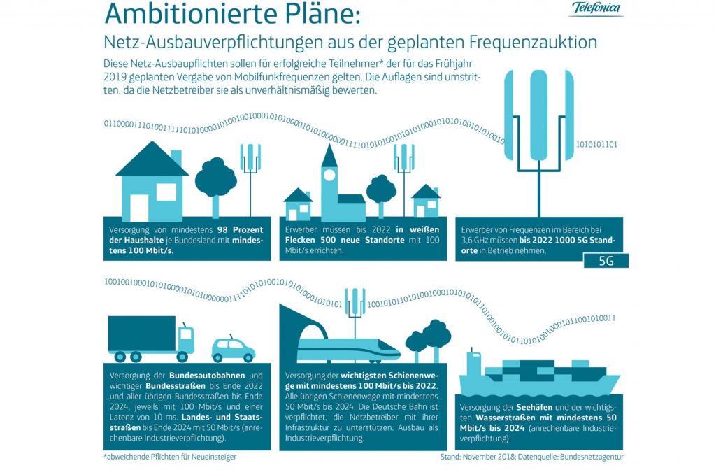 Netzbetreiber, die im Rahmen der Auktion Frequenznutzungsrechte erwerben, übernehmen dabei zugleich die Verpflichtung sogenannte Versorgungsauflagen zu erfüllen, um im Rahmen des Netzausbaus einen bestimmten Versorgungsgrad der Bevölkerung zu erreichen. Diese Auflagen waren im vergangenen Jahr Gegenstand intensiver politischer Diskussionen und haben nach Auffassung von Telefónica dazu geführt, dass das behördliche Vergabeverfahren der Bundesnetzagentur von politischen Interessen geleitet wurde. Die Debatte zum Mobilfunkausbau in Deutschland ist damit jedoch nicht beendet. So hat der Bundesrat am vergangenen Freitag mit großer Mehrheit der Länder einen Entschließungsantrag verabschiedet, wonach der Bund ein bundeseigenes Förderprogramm für den Mobilfunkausbau starten soll, um einen Flächendeckenden Mobilfunkausbau auch dort zu gewährleisten, wo er unter wirtschaftlichen Bedingungen für die privaten Mobilfunknetzbetreiber nicht rentabel ist. Die Mobilfunknetzbetreiber haben in der Vergangenheit stets kritisiert, dass das Ziel eines flächendeckenden Netzausbaus nur durch mehr Infrastrukturinvestitionen erreichbar ist, eine kostspielige Frequenzversteigerung dem jedoch entgegen steht.