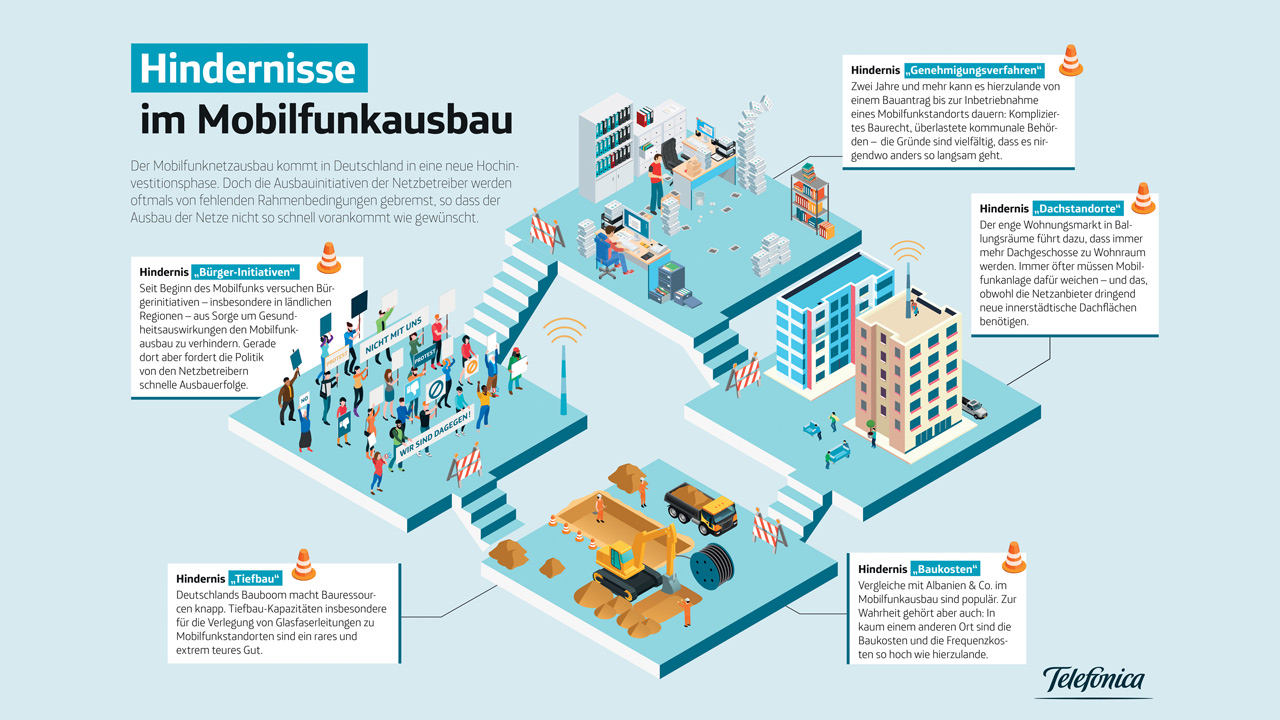 Einen Überblick über Hindernisse beim Mobilfunkausbau bietet eine interaktive Karte von Telefónica Deutschland. Grafik: BASECAMP