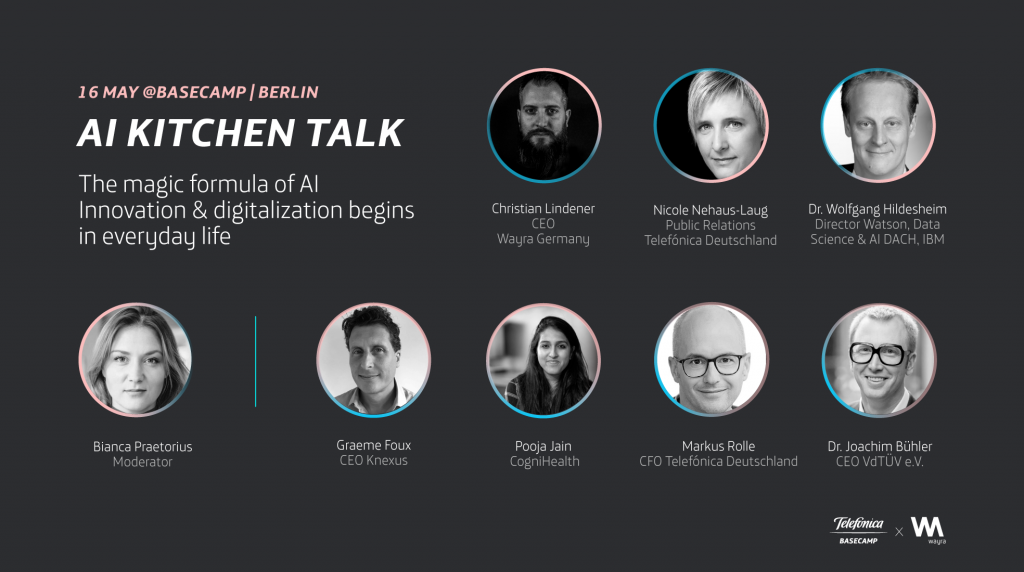 Die besten Gespräche finden am Küchentisch statt, das ist allgemein bekannt. Daher haben wir zusammen mit wayra, dem (Open) Innovation Hub von Telefónica, Experten aus Europa zum „AI Kitchen Talk“ am 16. Mai (öffnet in neuem Tab) ins Telefónica BASECAMP eingeladen. Wir wollen gemeinsam mit Dr. Wolfgang Hildesheim, Leiter IBM Watson und AI Innovation DACH-Region, Graeme Foux, CEO der KI-Plattform Knexus (öffnet in neuem Tab), Dr. Joachim Bühler, Geschäftsführer des VdTÜV e.V., Pooja Jain, Neurowissenschaftlerin und Mitgründerin von CogniHealth (öffnet in neuem Tab), sowie Markus Rolle, Chief Financial Officer (CFO) und Mitglied des Vorstands von Telefónica Deutschland, über die besten Rezepte für digitale Transformation und die Einführung neuer Technologien diskutieren.
