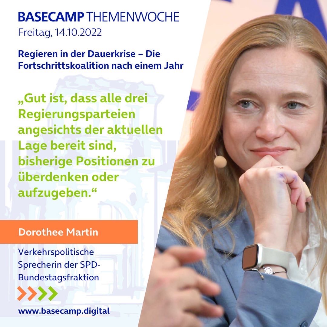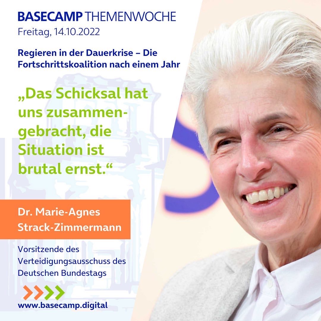 „Mehr Fortschritt wagen“ – diesen Titel gab die Ampel-Koalition ihrem Regierungsprojekt vor etwa einem Jahr. Die Aufbruchsstimmung war jedoch schnell passé: Der Krieg kam, Pandemie und Klimakrise blieben. Über das Regieren in der Dauerkrise und den Koalitionsfrieden sprachen im BASECAMP Marie-Agnes Strack-Zimmermann (FDP), Dorothee Martin (SPD), Tobias Lindner (B90/Die Grünen) und Gordon Repinski (ThePioneer) gemeinsam mit unseren Partnern von polisphere.