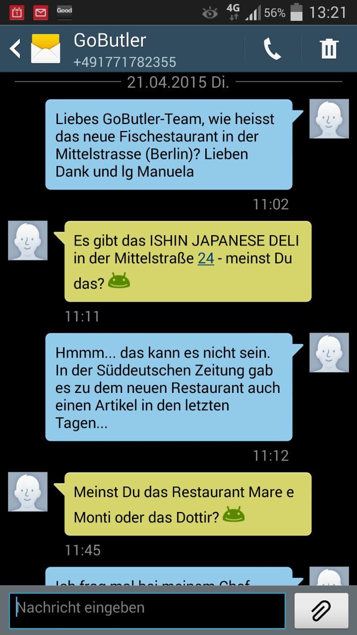 Das Angebot von GoButler erinnert an einen Geist aus der Flasche – nur mit dem Unterschied, dass man mehr als  nur drei Wünsche frei hat. Das Prinzip ist ganz einfach: Man registriert sich online unter: http://www.gobutlernow.com/ und erhält kurze Zeit später die Registrierungsbestätigung via E-Mail. Und dann kann es auch schon losgehen: Einfach eine SMS mit dem jeweiligen Wunsch bzw. Auftrag an die angegebene Nummer verschicken und kurze Zeit später erhält man direkt ein entsprechendes Feedback von einem der Teammitglieder, die 24/7 für ihre Kunden da sind. In Zeiten der SMS-Flats entstehen für den Nutzer keine zusätzlichen Kosten. Auf der Facebook-Seite von dem quirligen Start-up kann man sich einen guten Eindruck verschaffen, was für Aufträge bei den Berlinern so  eingehen: https://www.facebook.com/gobutlernow?fref=ts. Die einen bestellen Pizza, lassen Flüge buchen oder auch Blumen über GoButler verschicken und die anderen  bitten den SMS-Butler, für sie mit der Freundin Schluss zu machen. Klar. Das „Schluss machen via SMS“ können auch andere erledigen, da muss man sich nicht selber die Finger schmutzig machen. Der Case ist ein wenig verstörend, aber auch solche ungewöhnlichen Fälle erledigt das Start-up für ihre Kunden.