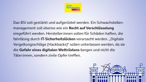Durch die ständig zunehmende Digitalisierung von Diensten und Abläufen, sowohl im Privaten, als auch in der Wirtschaft und auf staatlicher Ebene, wird die Frage nach IT-Sicherheit immer relevanter. Wie sollen Bürger:innen, Staat und Wirtschaft am besten vor Cyber-Angriffen geschützt, welche Behörden damit beauftragt werden? Hier die Forderungen und Vorschläge der einzelnen Parteien im Überblick: