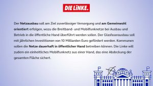 Noch hinkt Deutschland in Sachen Digitale Infrastruktur im OECD-Vergleich hinterher. Dass sich das in der nächsten Legislaturperiode ändern soll, damit Deutschland „2030 über eine digitale Infrastruktur auf Weltniveau“ (SPD Wahlprogramm) verfügt, wird von allen Parteien unterstützt. Im Weg dorthin unterscheiden sie sich jedoch: