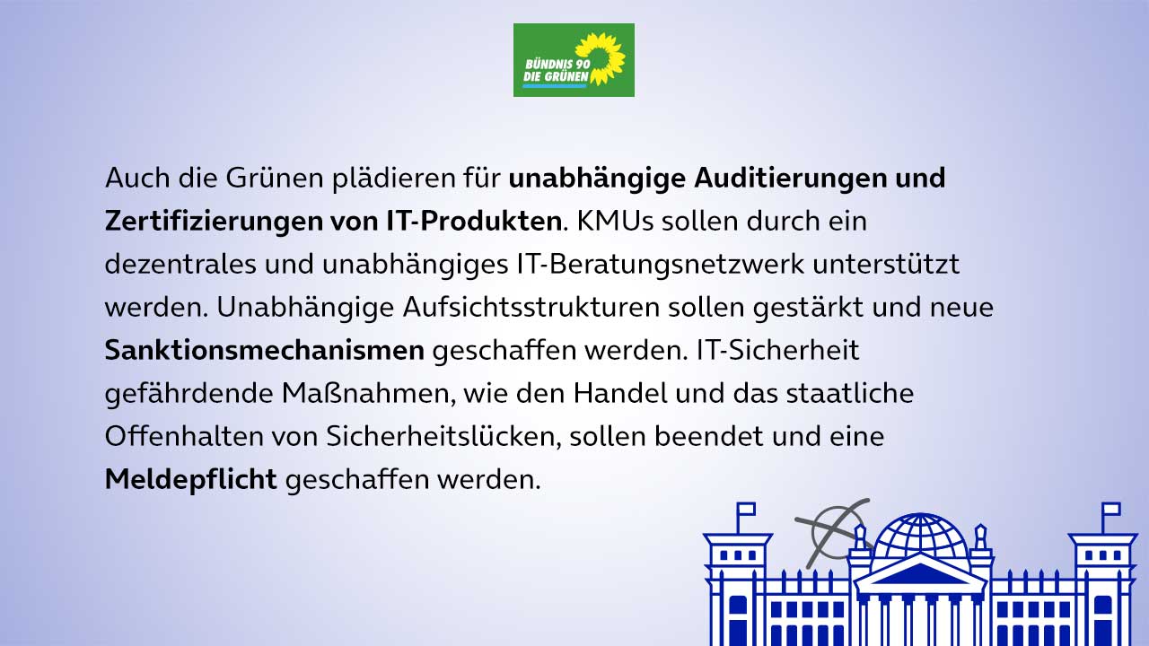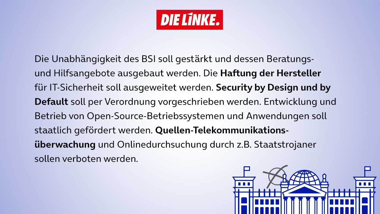 In unserer dreiteiligen Serie zu den Wahlprogrammen der Parteien CDU/CSU (öffnet in neuem Tab), SPD (öffnet in neuem Tab), Bündnis 90/Die Grünen (öffnet in neuem Tab), FDP (öffnet in neuem Tab) und Die Linke (öffnet in neuem Tab) für die Bundestagswahlen im September (öffnet in neuem Tab), blicken wir zunächst darauf, wie sie sich zu den Themen IT-Sicherheit, Digitale Infrastruktur und Verbraucherschutz positionieren. Was sind ihre Forderungen, was ihre Antworten, um den drängenden Fragen in diesen Bereichen gerecht zu werden? Wir geben einen Überblick über einige der zentralen Vorschläge.
