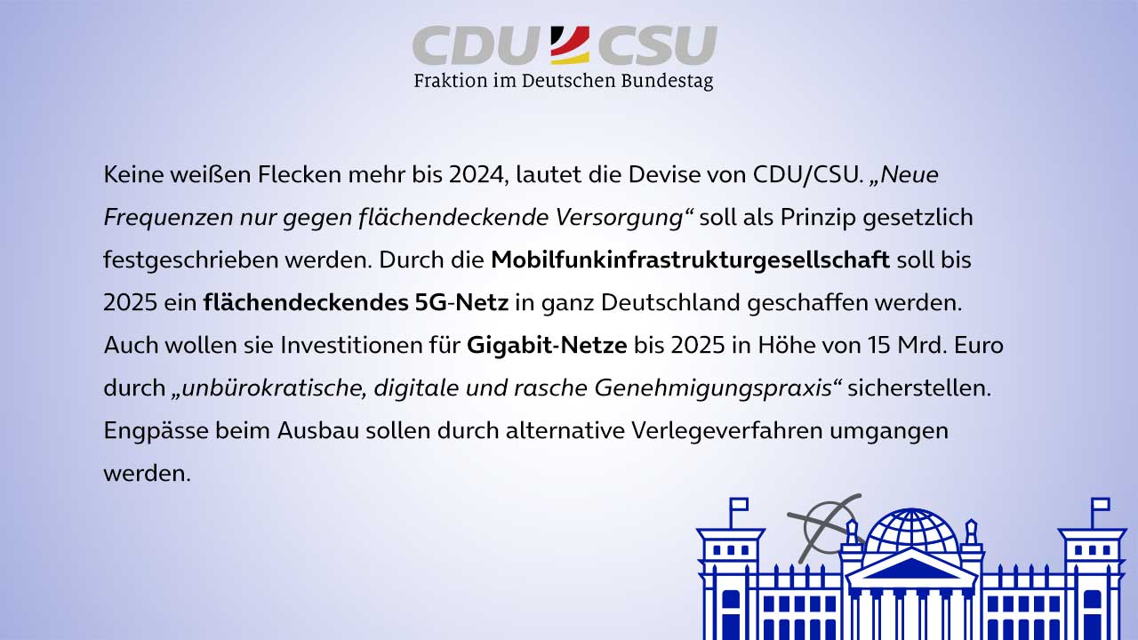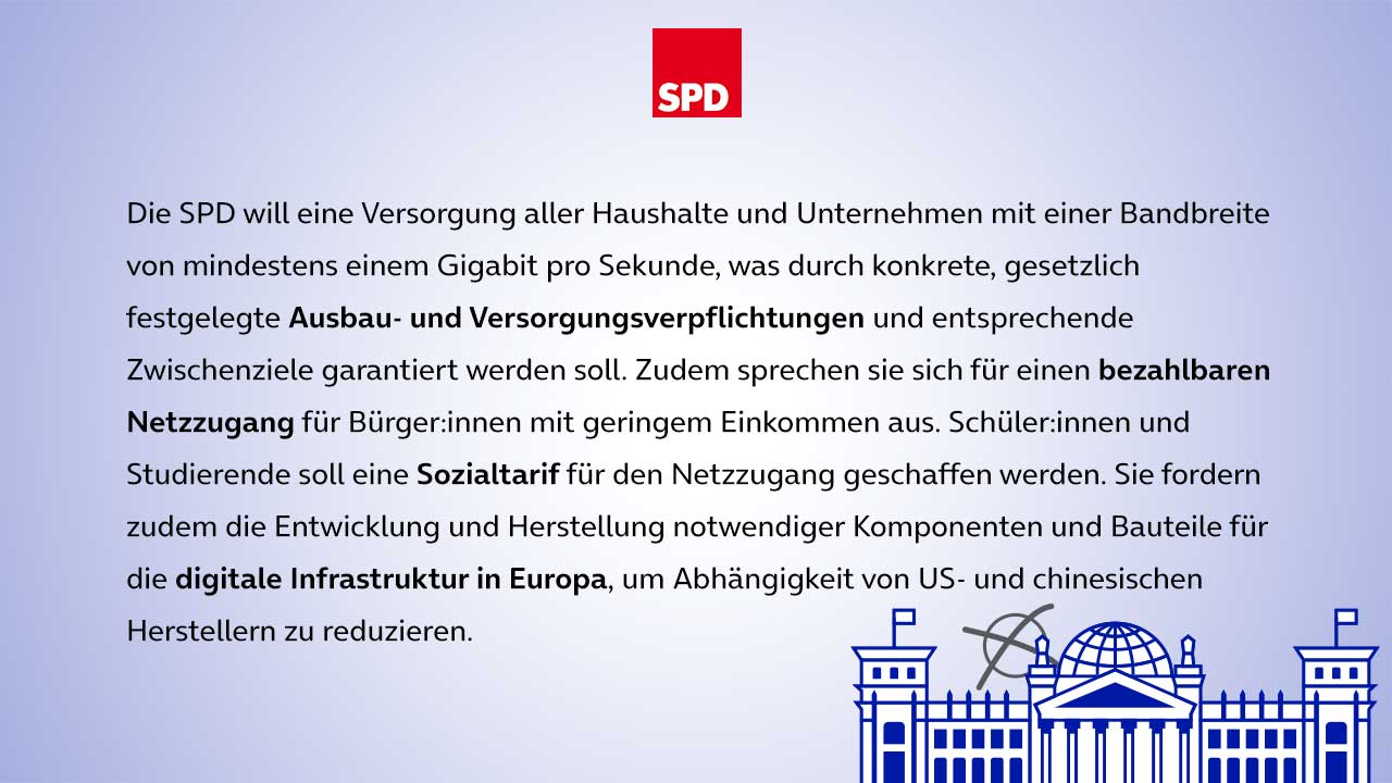 Noch hinkt Deutschland in Sachen Digitale Infrastruktur im OECD-Vergleich hinterher. Dass sich das in der nächsten Legislaturperiode ändern soll, damit Deutschland „2030 über eine digitale Infrastruktur auf Weltniveau“ (SPD Wahlprogramm) verfügt, wird von allen Parteien unterstützt. Im Weg dorthin unterscheiden sie sich jedoch: