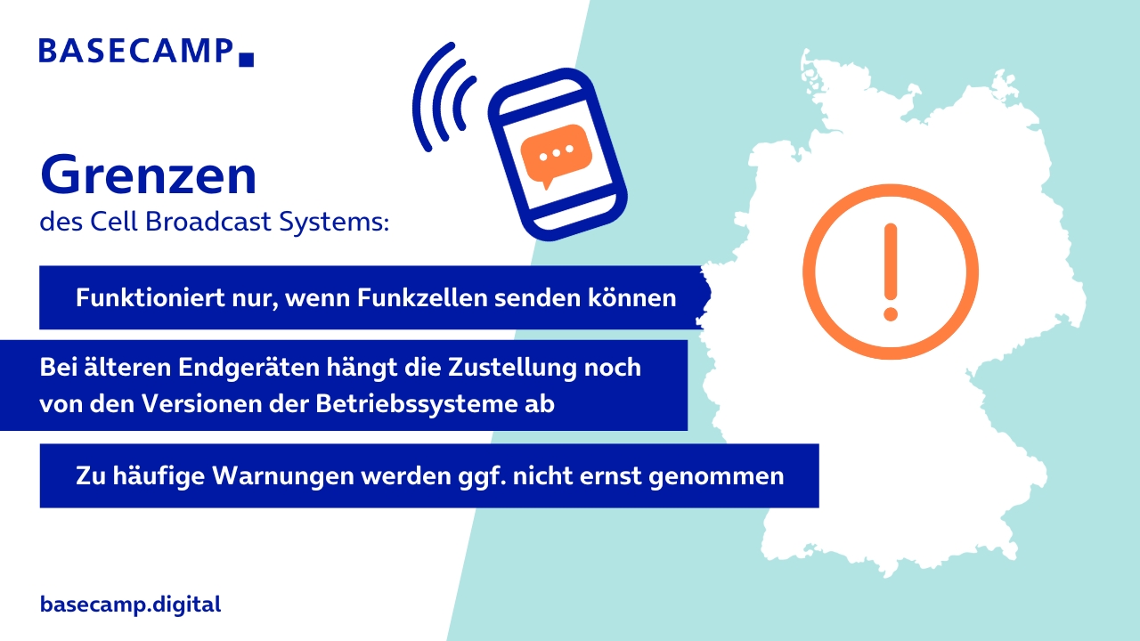 So gut das alles klingt, gibt es aber natürlich auch für das CB-System gewisse Grenzen bzw. Aspekte, die in der Anwendung zu beachten sind. Zum einen erreichen die Warnungen die Empfangsgeräte nur, solange die Funkzellen senden können und nicht durch äußere Einflüsse ausfallen, beispielsweise eine komplette Zerstörung aufgrund der Katastrophe. Zum anderen hängt die Zustellung bei älteren Endgeräten derzeit noch von den Versionen der Betriebssysteme ab.
