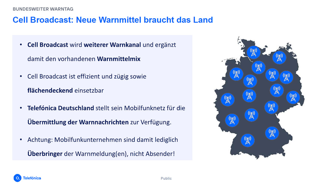 Wichtig ist hierbei, dass für die Inhalte der Warnmeldungen allein das Bundesamt für Bevölkerungsschutz und Katastrophenhilfe (BBK) zuständig ist. Die Telekommunikationsunternehmen stellen als einer von vielen Warnmultiplikatoren lediglich ihre Netzinfrastruktur zur Verfügung und sind somit nur der Überbringer, nicht aber der Ersteller oder Absender der Nachrichten.