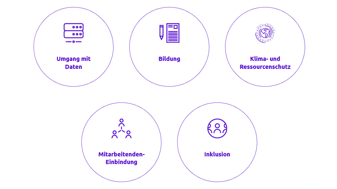 Die Unternehmen können allerdings eigene Schwerpunkte in ihren Berichten (öffnet in neuem Tab) setzen, wie auch die Vorstellung von ausgewählten Maßnahmen und Beispielen auf der Konferenz zeigte. So widmeten sich die beteiligten Unternehmen Barmer, ING, Deutsche Telekom und Zalando jeweils unterschiedlichen Aspekten der fünf Handlungsfelder „Umgang mit Daten“, „Bildung“, „Klima- und Ressourcenschutz“, „Einbindung der Mitarbeiter:innen“ und „Inklusion“.