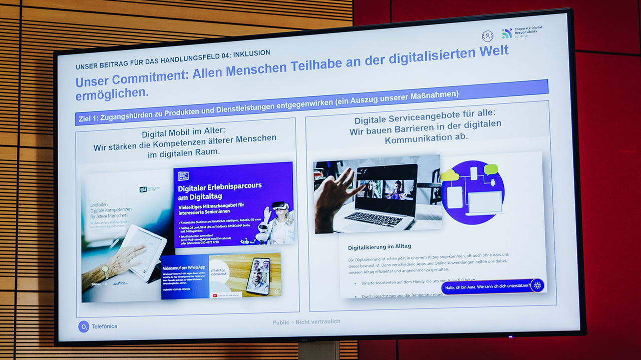 Zum Handlungsfeld der Inklusion präsentierte schließlich Melanie Borsos, Senior Corporate Responsibility Managerin bei Telefónica Deutschland, einige Maßnahmen des Unternehmens, die Zugangshürden zu Produkten und Dienstleistungen abbauen und die digitale Teilhabe aller gesellschaftlichen Gruppen fördern sollen. Dazu verwies sie besonders auf das Programm „Digital Mobil im Alter“ (öffnet in neuem Tab), das sich an Senior:innen richtet, sowie auf digitale Serviceangebote für Schulen und Lehrkräfte wie das Digitalpaket von O2 (öffnet in neuem Tab). Und mit dem BASECAMP betreibt das Unternehmen eine zentrale Plattform für den gesellschaftlichen Dialog über eine werteorientierte Digitalisierung.