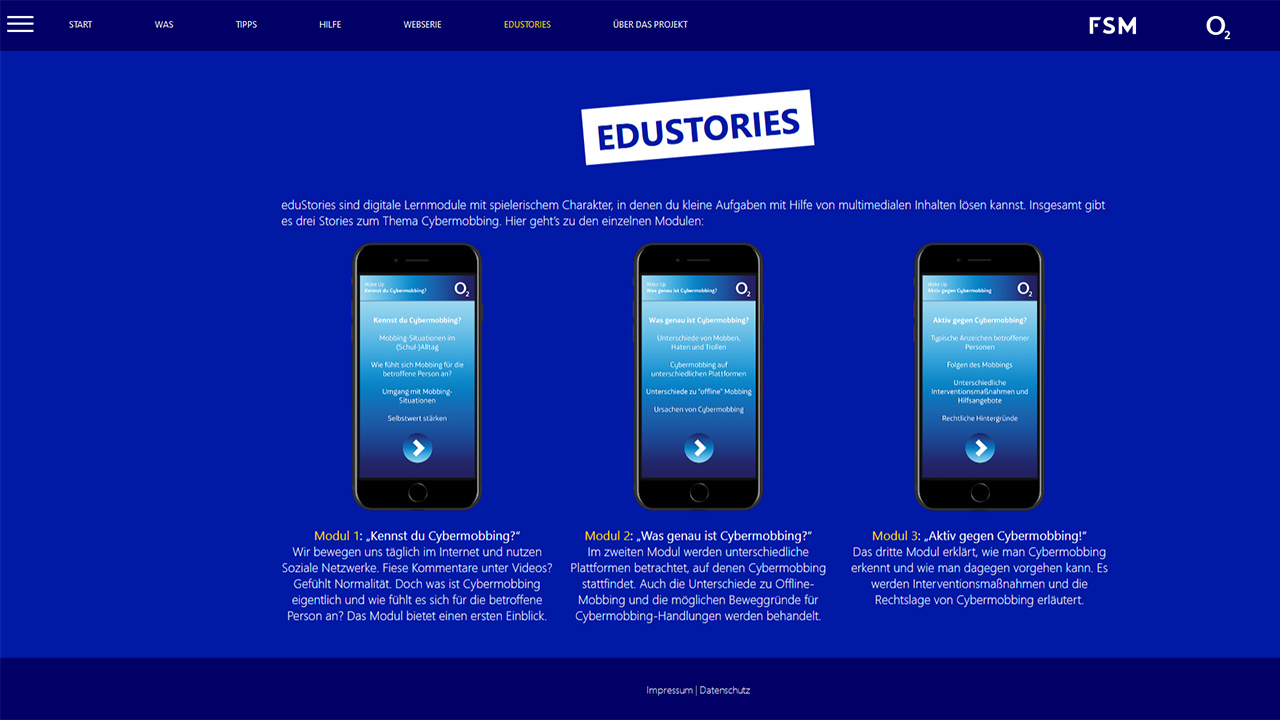 Im Rahmen der Initiative wurde dazu eine sechsteilige Webserie (öffnet in neuem Tab) sowie drei Lernmodule – sogenannte eduStories (öffnet in neuem Tab) – zum Thema Cybermobbing entwickelt. Darin erfahren Schüler*innen, Lehrkräfte und Eltern, was Cybermobbing ist und wie sie zu einem fairen, respektvollen Umgang im Netz beitragen können. Hinter dem Projekt steckt ein pädagogisches Konzept. Durch die interaktive Kompetenzvermittlung können die Inhalte der Initiative auch an Schulen sowie auf Workshops, Messen und Events eingesetzt werden.
