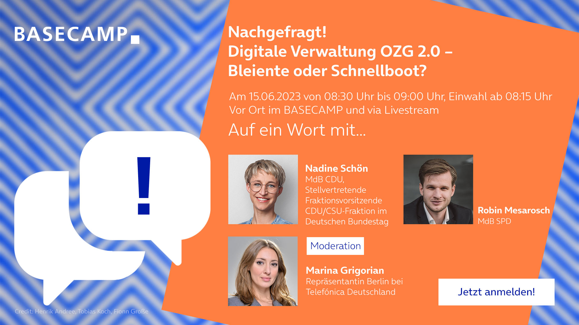 Wir dürfen gespannt sein, inwiefern dies in den anstehenden parlamentarischen Beratungen des Änderungsgesetzes eine Rolle spielen wird. Wer mehr zum möglichen Gelingen des OZG 2.0 erfahren möchte, ist außerdem herzlich zu unserer nächsten Ausgabe von „Nachgefragt!“ (öffnet in neuem Tab) am 15. Juni im BASECAMP eingeladen.