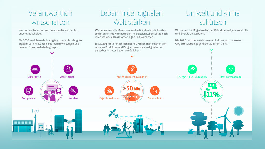 Für uns gehört es zum Selbstverständnis, das Thema Nachhaltigkeit in der DNA des Unternehmens zu verankern. Das lässt sich auch an den Unternehmenszielen ablesen. Unser Responsible Businessplan beinhaltet, dass wir uns entlang der Wertschöpfungskette über alle Bereiche hinweg Nachhaltigkeitsziele setzen. Wir finden, als verantwortungsvolles Unternehmen muss man sich Gedanken darüber machen, welche Auswirkungen die Geschäftstätigkeit auf Menschen und Umwelt hat. Gerade das Thema Umwelt begleitet uns schon länger. Unser spanischer Mutterkonzern hat sich bereits vor einigen Jahren eindeutig zum Klimaschutz bekannt und entsprechende Maßnahmen umgesetzt. Eine der neuesten Initiativen ist beispielsweise das Bündnis „Business Ambition for 1.5° C“ (öffnet in neuem Tab), bei dem wir uns gemeinsam mit den Vereinten Nationen zum Ziel gesetzt haben, das Klima zu schützen. Nachhaltigkeit ist also nicht nur bei Telefónica Deutschland, sondern auch in dem globalen Selbstverständnis verankert.