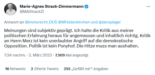 Auch SPD-Politiker Michael Roth sorgte kürzlich für Twitter-Schlagzeilen. Nach einer kontroversen Aktion der “Letzten Generation” verglich er in einem – mittlerweile gelöschten – Tweet (öffnet in neuem Tab)deren Vorgehen mit dem der Taliban und wurde dafür heftig kritisiert. Auch Roth verteidigte seine Position, und ähnlich wie im Fall von Künast entstand keine konstruktive Diskussion; die Fronten verhärteten sich. So unterschiedlich beide Fälle gelagert sind, die Dynamik der diskursiven Abwärtsspirale ähnelt sich. Auch Verteidigungsexpertin Marie-Agnes Strack-Zimmermann (FDP) twittert regelmäßig und nutzt die Plattform oft, um auf Vorwürfe anderer zu reagieren. Nachdem ihre spitze Kritik an CDU-Chef Friedrich Merz Reaktionen hervorrief, die Strack-Zimmermann inhaltliche und strategische Fehler attestierten, konterte (öffnet in neuem Tab) die Politikerin auf der Plattform.
