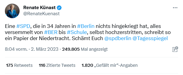 Ein aktuelles Beispiel für hitzige politische Diskussionskultur auf Twitter offenbart sich in den Koalitionsverhandlungen in Berlin. So äußerte sich Grünen-Politikerin Renate Künast, die selbst häufig mit grenzüberschreitenden Angriffen zu kämpfen hat, zur Koalitionsentscheidung der SPD mit: “Niederträchtig (öffnet in neuem Tab)” sei deren Sondierungspapier, “hochzerstritten” die Partei selbst. eine Kommunikation, die durchaus stilbildend auf Twitter war.