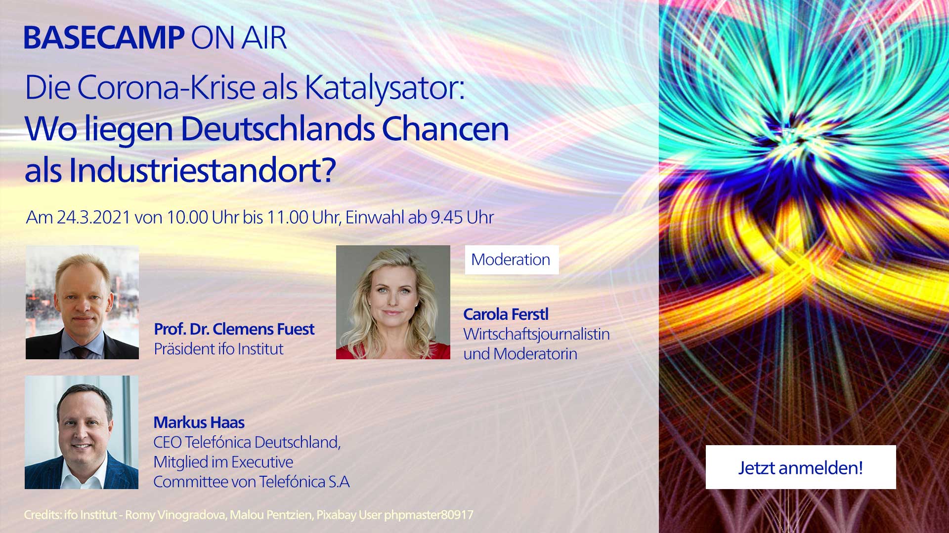 Unser nächstes Thema ist die digitale Zukunft Deutschlands. Hierzu diskutieren Telefónica Deutschlandchef Markus Haas und der Präsident des Ifo Instituts Prof. Dr. Clemens Fuest am 24. März 2021 (öffnet in neuem Tab) bei unserem Format „Corona – Krise als Katalysator: Wo liegen Deutschlands Chancen als Industriestandort?“. Dabei gehen wir der Frage nach, wie wir den Digitalisierungsschub durch die Corona-Krise nutzen können und welche Rolle 5G in der digitalen Infrastruktur von morgen spielt? Wir laden alle Interessierten herzlich dazu ein mitzudiskutieren, und freuen uns auf alle Besucher im BASECAMP ON AIR – unserem virtuellen Debattenraum!