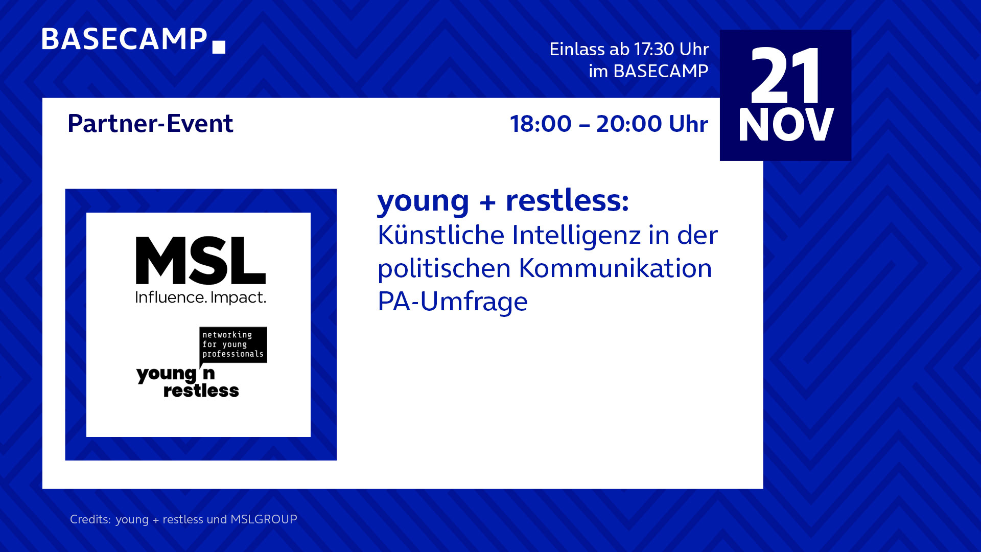 young + restless ist das Netzwerktreffen für Young Professionals aus dem politischen Berlin, der Startup-Szene, der Medienwelt sowie der Kreativwirtschaft. Die Veranstaltungsreihe findet seit 2015 im BASECAMP statt und wird von meko factory – Werkstatt für Medienkompetenz GmbH organisiert.