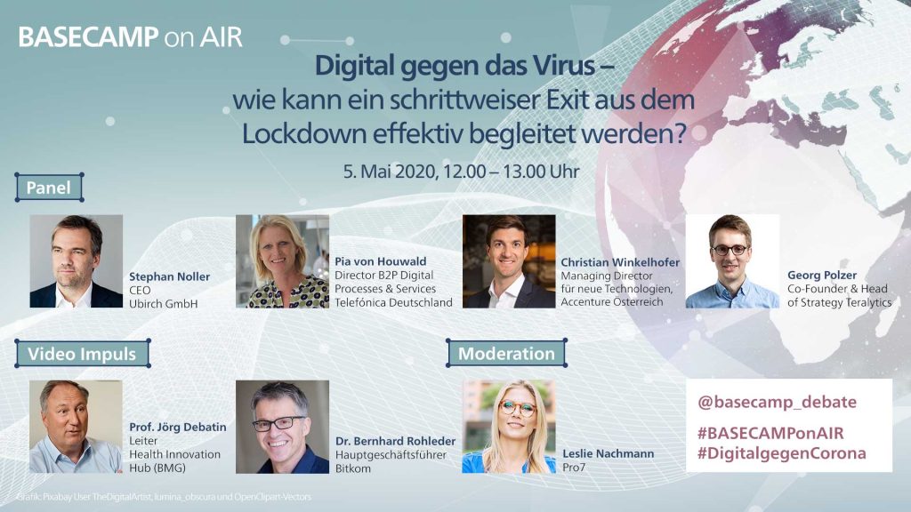 Am 5. Mai 2020 von 12.00 – 13.00 Uhr diskutieren wir bei der BASECAMP ON AIR-Veranstaltung „Digital gegen das Virus – wie kann ein schrittweiser Exit aus dem Lockdown effektiv begleitet werden?“ folgende Fragen: