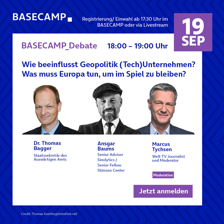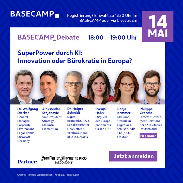 Wir weisen darauf hin, dass bei unseren öffentlichen Veranstaltungen auch Bild- und Tonmaterial in Form von Fotos oder Videoaufzeichnungen durch von uns beauftragte oder akkreditierte Personen und Dienstleister erstellt wird. Die Aufnahmen werden für die Event-Dokumentation und Event- Kommunikation auf den Social-Media-Kanälen des BASECAMP genutzt. Sie haben das Recht auf Information und weitere Betroffenenrechte. Informationen zu unseren Datenverarbeitungen sowie Ihren Betroffenenrechten finden Sie hier.