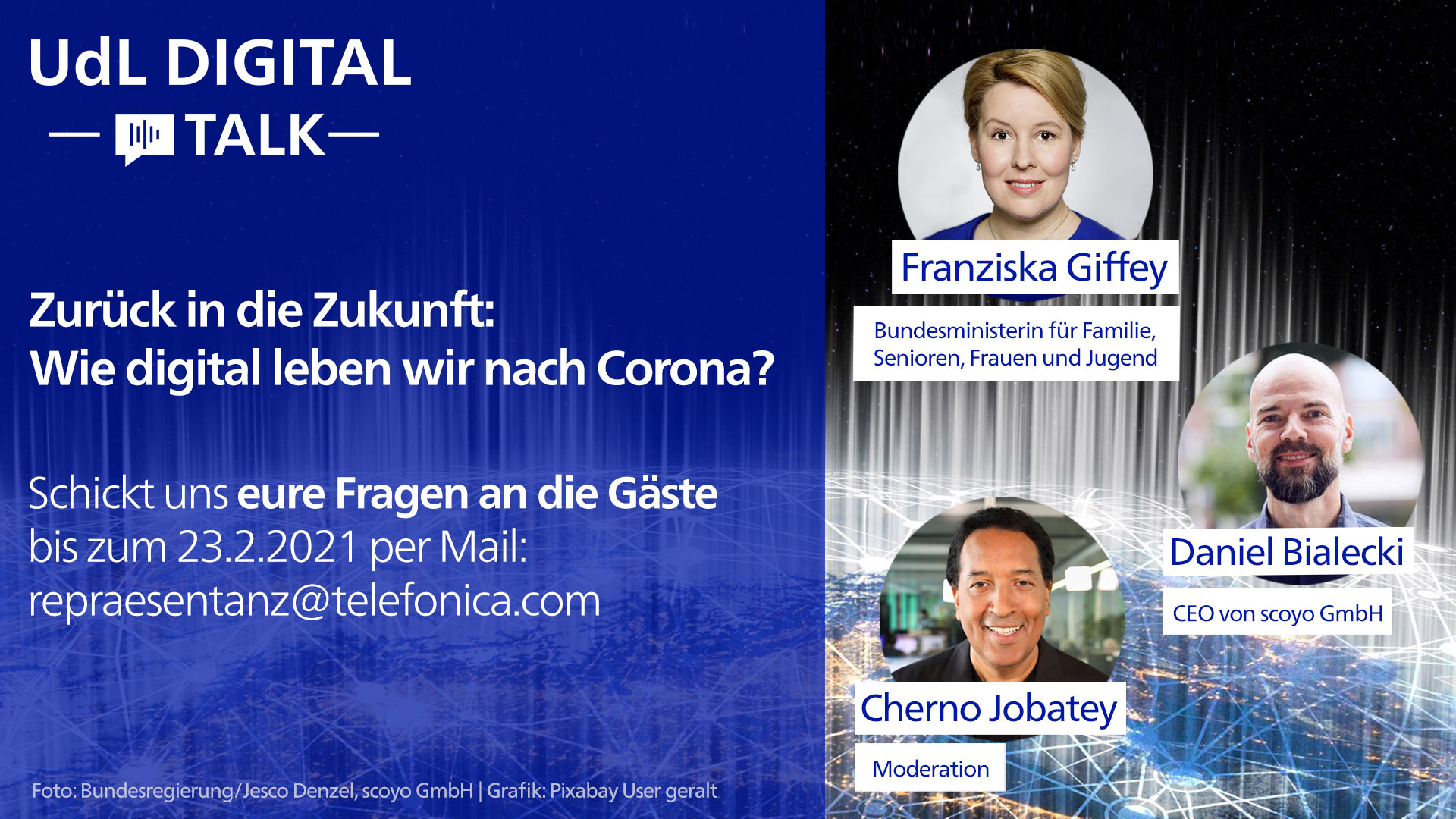 Am 24. Februar werden unter dem Titel „Zurück in die Zukunft: Wie digital leben wir nach Corona?“ Franziska Giffey (öffnet in neuem Tab), Bundesministerin für Familie, Senioren, Frauen und Jugend (öffnet in neuem Tab), und Daniel Bialecki (öffnet in neuem Tab), CEO von Scoyo GmbH (öffnet in neuem Tab), beim nächsten UdL Digital Talk (öffnet in neuem Tab) über die digitale Zukunft Deutschlands diskutieren, moderiert von Cherno Jobatey (öffnet in neuem Tab). Organisatorisch wird der Talk erneut anders verlaufen als gewohnt: Wegen der nach wie vor aktuellen Maßnahmen ist leider kein Publikum im BASECAMP erlaubt. Ihre Fragen sind uns natürlich dennoch wichtig!