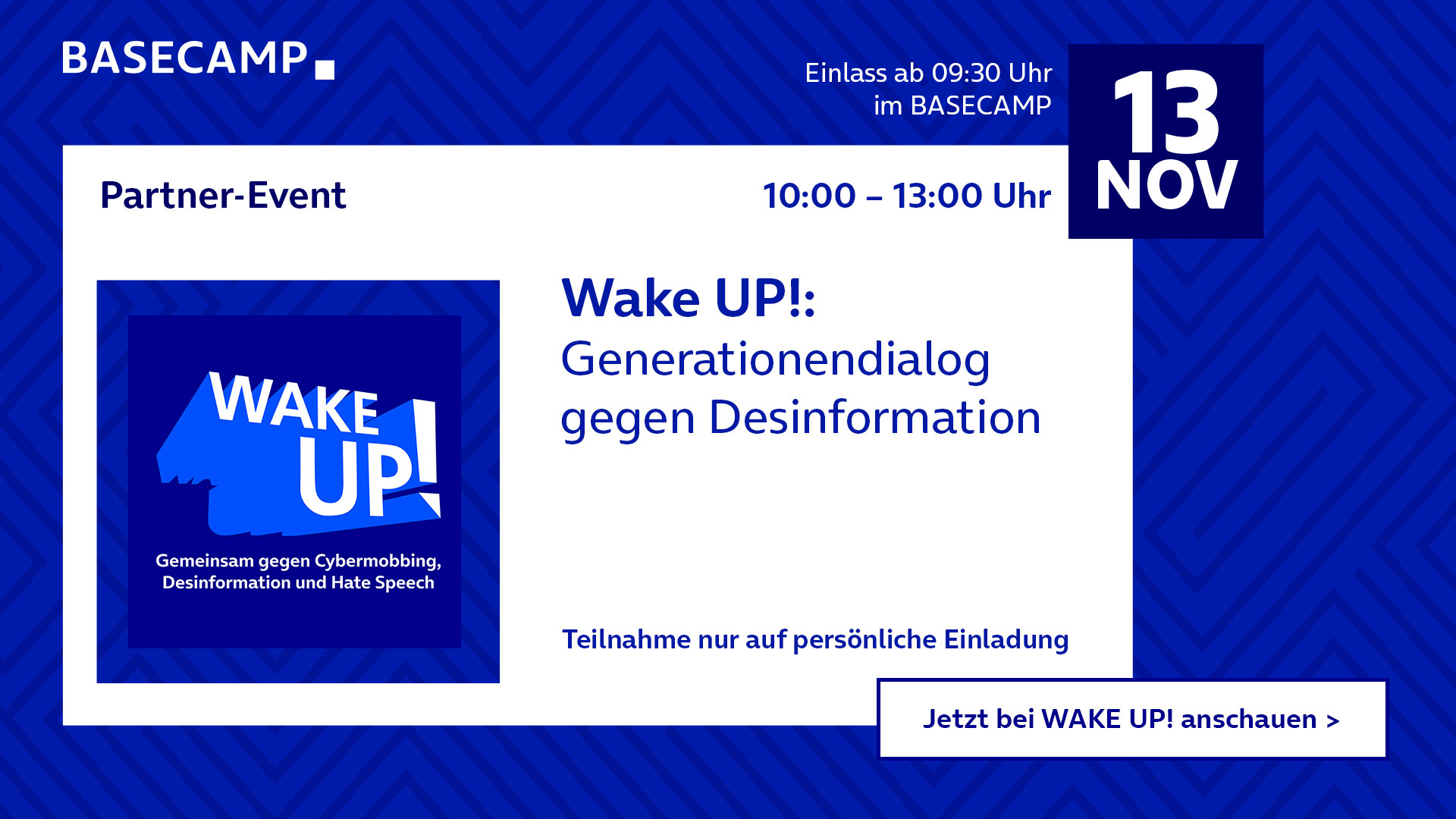 Wir weisen darauf hin, dass bei unseren öffentlichen Veranstaltungen auch Bild- und Tonmaterial in Form von Fotos oder Videoaufzeichnungen durch von uns beauftragte oder akkreditierte Personen und Dienstleister erstellt wird. Die Aufnahmen werden für die Event-Dokumentation und Event- Kommunikation auf den Social-Media-Kanälen des BASECAMP genutzt. Sie haben das Recht auf Information und weitere Betroffenenrechte. Informationen zu unseren Datenverarbeitungen sowie Ihren Betroffenenrechten finden Sie hier.