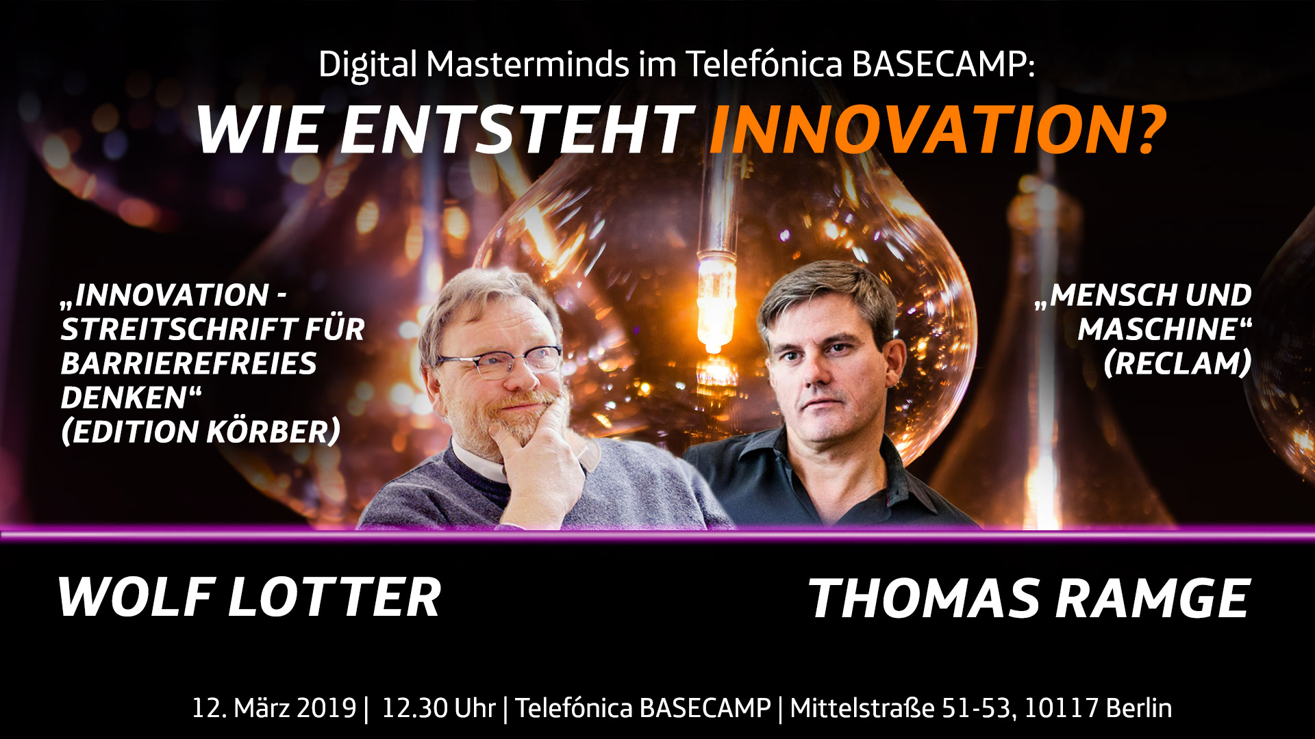 Am 12. März erwartet uns bei der Veranstaltungsreihe Digital Masterminds (öffnet in neuem Tab) ein interessantes Streitgespräch, zu dem auch wieder ein leckeres Mittagsbuffet gehört. Wolf Lotter, Mitgründer und Essayist des Wirtschaftsmagazins brand eins (öffnet in neuem Tab), diskutiert mit dem Wirtschaftsjournalisten und KI-Experten Thomas Ramge über die Frage: „Wie entsteht Innovation?“ Das Thema beschäftigt beide Autoren seit Jahren und steht auch im Zentrum ihrer neuen Bücher. Doch sie geben ganz verschiedene Antworten auf die Frage. Wer die Diskussion im Telefónica BASECAMP erleben möchte, muss nur die Anmeldemaske neben diesem Artikel ausfüllen. Oder den Videostream ansehen, den wir hier auf der Webseite zeigen werden.