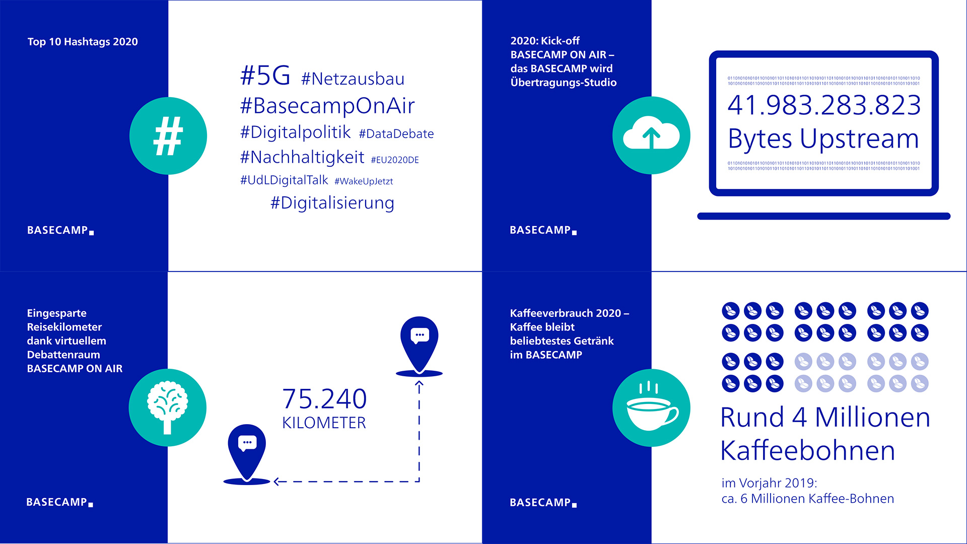 2020 wurde auch von der Erkenntnis geprägt, wie wichtig eine funktionierende Digitalisierung ist. Unser Wirtschafts- und Sozialleben war in Zeiten der Pandemie in noch nie dagewesenem Ausmaß davon abhängig. Die dafür notwendigen Netze waren stabil und haben es uns allen ermöglicht, in einer Zeit zusammenzukommen, in der Abstandhalten eines der wichtigsten Gebote ist. Mit dem Titel „Digital gegen das Virus“ griff folglich auch die Premiere unseres digitalen Event-Formats BASECAMP ON AIR dieses Thema auf. Bis heute folgten 19 weitere BASECAMP ON AIR Events, die zunächst in rein digitaler Form, später, als es die Auflagen wieder zuließen, auch mit hybriden Konzepten umgesetzt oder für die das BASECAMP in Berlin-Mitte als Sendestudio eingesetzt wurde.