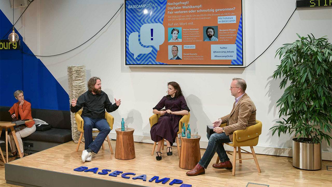 Highlights in unserem Debattenraum „Basecamp on Air“ waren zudem die „Digital Dish“-Veranstaltung (öffnet in neuem Tab) mit dem Aspen Institute über die Technologiebeziehung zwischen der EU und China, das Event „Generation Diversity – Über Babyboomer, GenXYZ, Respekt & Werte“ (öffnet in neuem Tab) oder darüber, wie Unternehmen und Investoren mittels „Sustainable Finance“ (öffnet in neuem Tab) den Klimawandel bremsen können. Hervorzuheben sind hier ebenso Partner Events, z.B. die BACB Podiumsdiskussion mit den Spitzenpolitiker:innen der Berliner Parteien zum Thema Startup Hauptstadt Berlin (öffnet in neuem Tab) oder das Community Meetup zum zweijährigen Jubiläum der Initiative „Wir sind der Osten“.