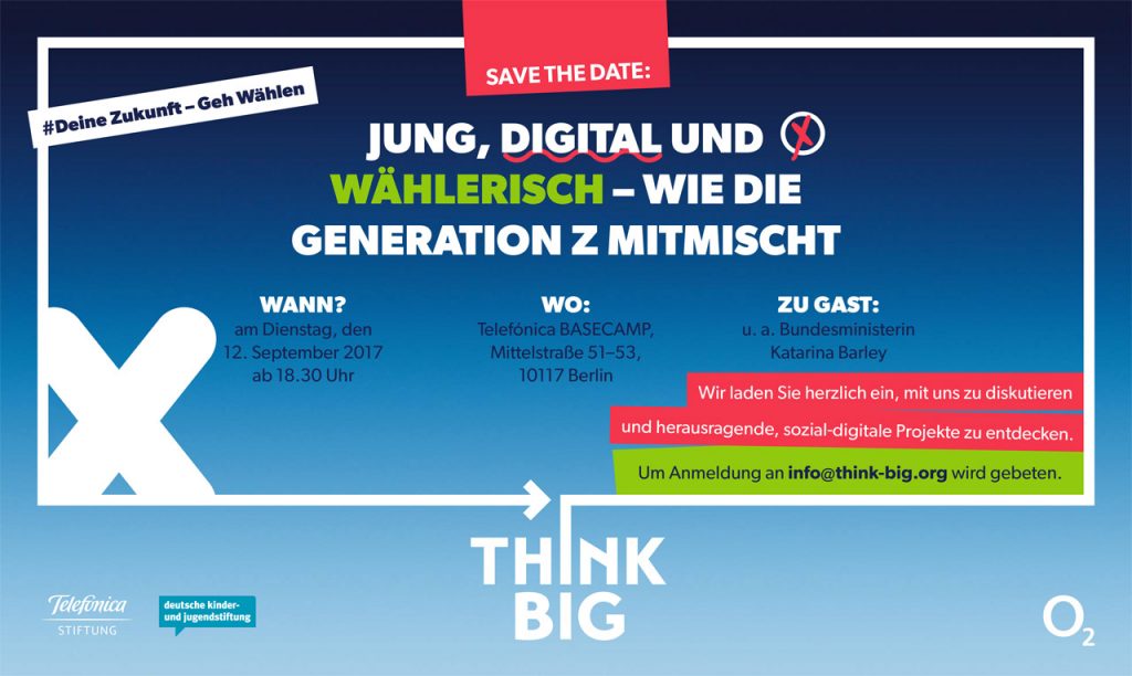 Am 12. September findet im Telefónica BASECAMP das Kampagnenevent zur Teilhabe von jungen Menschen an politischen Prozessen mit der Schirmherrin von Think Big, Katarina Barley. der Bundesministerin für Familien, Senioren, Frauen und Jugend. Seien Sie dabei und diskutieren Sie mit Miniterin Barley über das demokratische Engagement junger Menschen. Anmelden können Sie sich per eMail unter: info@think-big.org
