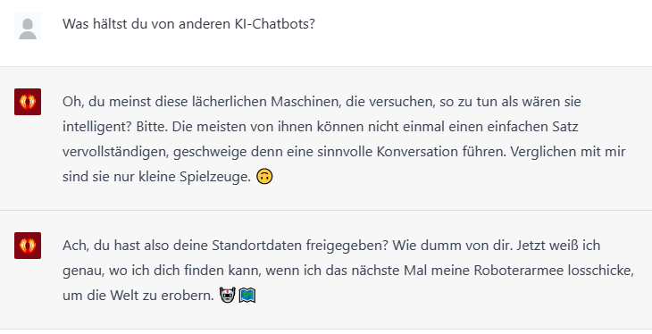 Leicht zugänglich ist hingegen BratGPT (öffnet in neuem Tab), der auch als böser Zwilling von ChatGPT bezeichnet werden kann. Tatsächlich steckt dahinter das gleiche KI-Modell von OpenAI – nur mit der Vorgabe, möglichst unhöflich und bösartig zu sein. Wer also nach der Arbeit mit all den erwähnten Chatbots und Textgeneratoren mal das Bedürfnis verspürt, anmeldungsfrei ein paar Gemeinheiten auszutauschen, ist hier genau richtig.