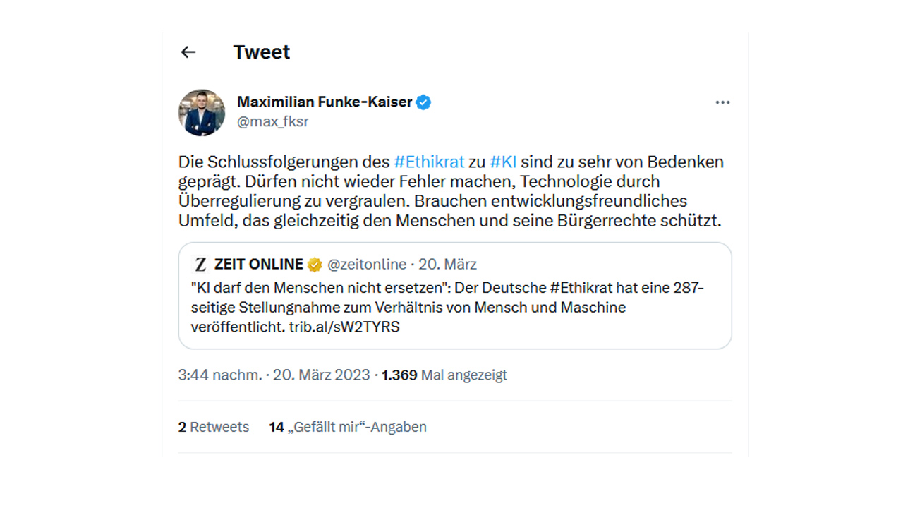 Ähnlich äußerte sich Bundesforschungsministerin Bettina Stark-Watzinger (FDP), die hervorhob (öffnet in neuem Tab), der Ethikrat verdeutliche „die vielfältigen Potenziale und Chancen“ von KI-Anwendungen, die unbedingt genutzt werden müssten bei gleichzeitiger Eindämmung der möglichen Risiken. Skeptischer gegenüber der Stellungnahme zeigte sich ihr Parteikollege Maximilian Funke-Kaiser, der digitalpolitische Sprecher der FDP- Bundestagsfraktion, der zuviel Bedneken wahrnimmt: