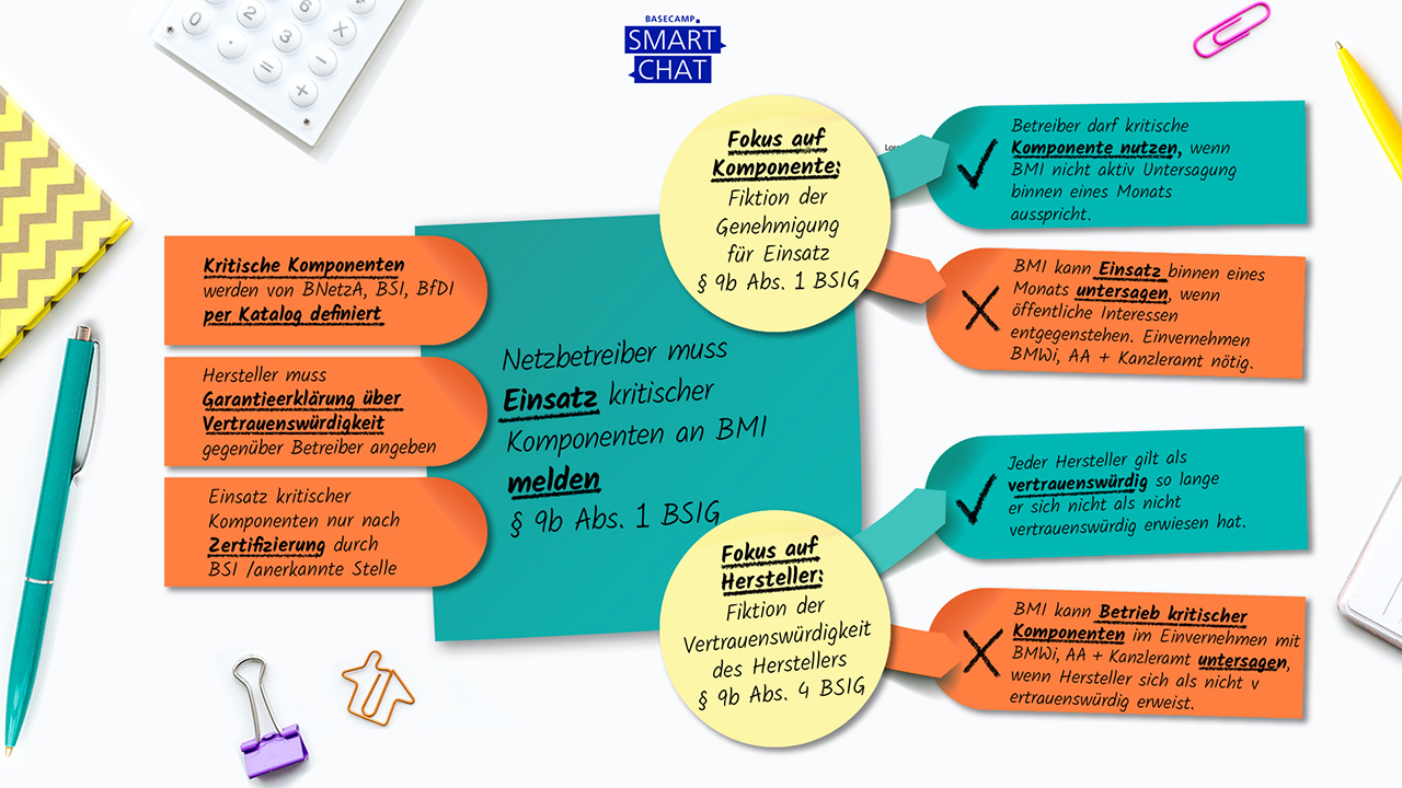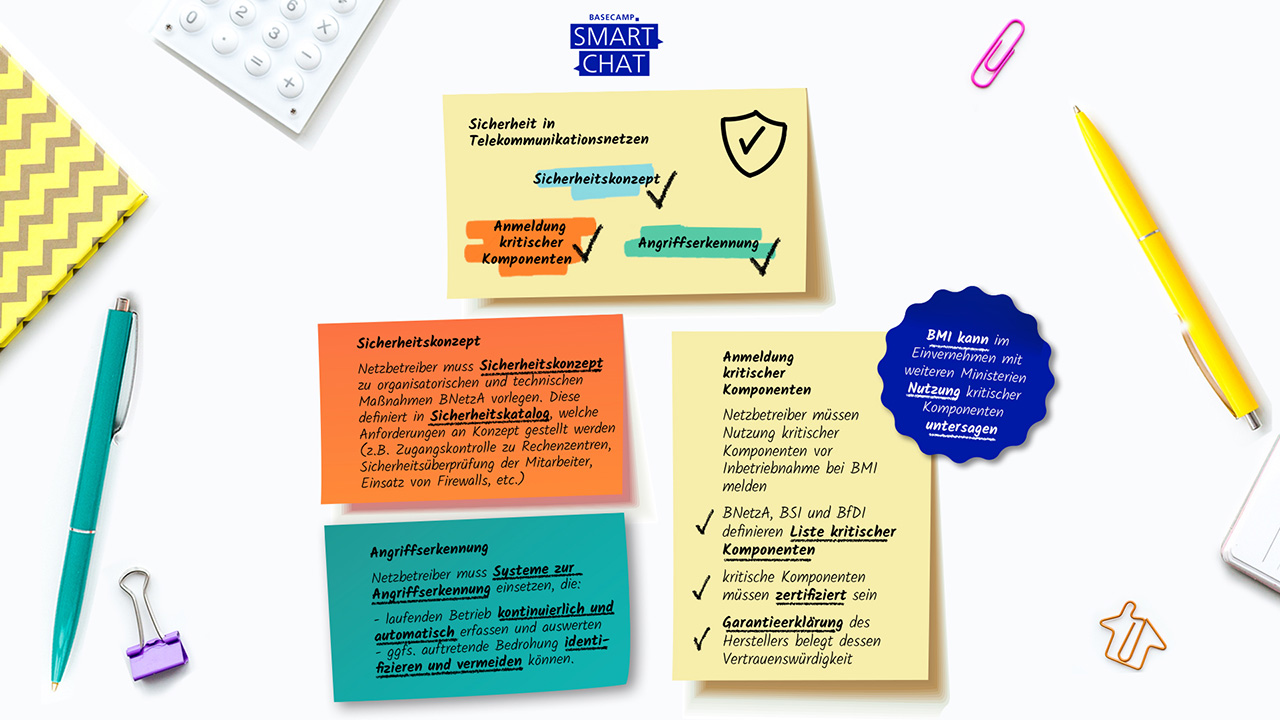 Der Entwurf des IT-SiG sieht vor, dass Telekommunikationsnetzbetreiber Sicherheitsmaßnahmen auf mehreren Ebenen umsetzen müssen. Neben dem bereits heute verpflichtenden Sicherheitskonzept, welches den Anforderungen eines von Bundesnetzagentur (BNetzA) und dem Bundesamt für Sicherheit in der Informationstechnik (BSI) (öffnet in neuem Tab) definierten Sicherheitskatalogs entsprechen muss, sollen nun auch der Einsatz von automatisierten Angriffserkennungssystemen und eine Pflicht zur Anmeldung der Nutzung kritischer Komponenten beim Bundesinnenministerin hinzukommen.