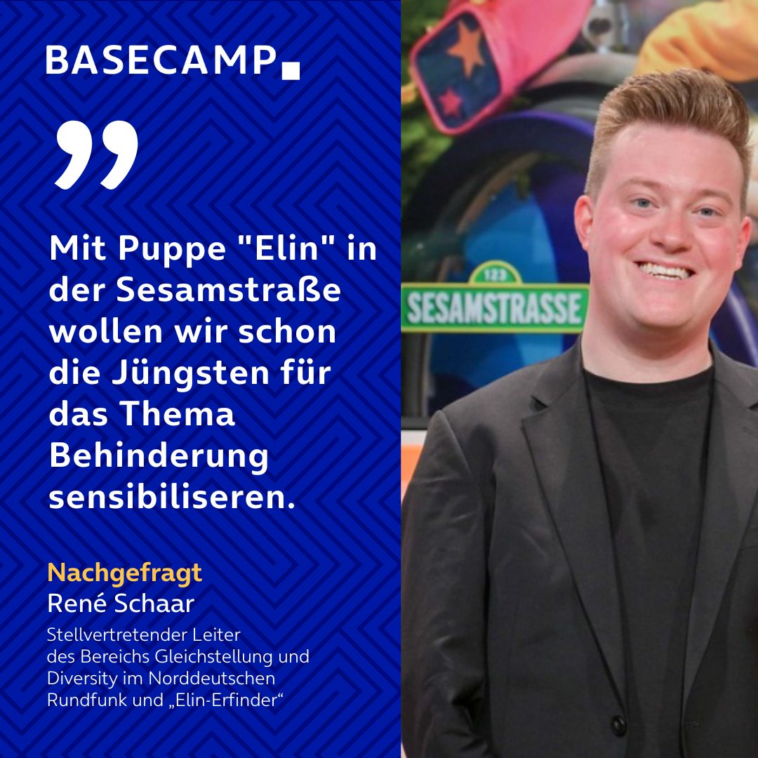 Am 4. Bundesweiten Digitaltag am 16. Juni, der in diesem Jahr unter dem Motto „Digitalisierung – Entdecken. Verstehen. Gestalten“ steht, gab es etwas ganz Neues in der „Nachgefragt“-Reihe im BASECAMP von Telefónica Deuthschland in Berlin zum Thema Inklusion: den Auftritt einer Puppe. „Elin“ ist die „Neue“ in der Sesamstraße, wirkt wie die kleine Schwester von „Ernie“ und wird ab Herbst in der NDR-Produktion zu sehen sein. „Elin“ ist ein technikbegeistertes Mädchen und schraubt gern an ihrem Rollstuhl herum, um ihn schneller zu machen. Und „Elin“ ist die Erfindung von René Schaar (öffnet in neuem Tab), dem stellvertretenden Leiter des Bereichs Gleichstellung und Diversity im Norddeutschen Rundfunk.