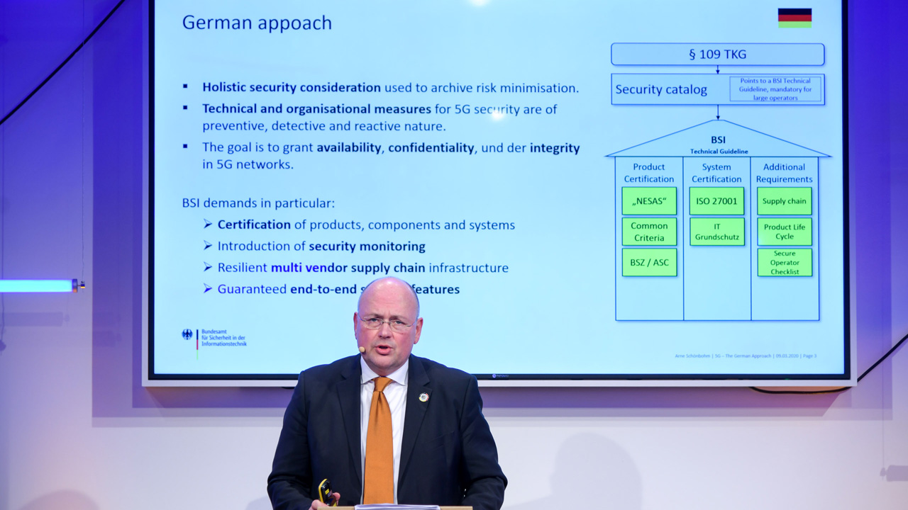 Auf Seiten der Bundesbehörden ist BSI-Präsident Arne Schönbohm für die Sicherheit der neuen Telekommunikationstechnologie zuständig. Er skizzierte noch einmal die Kernpunkte der europäisch abgestimmten Sicherheitsvorgaben für den 5G-Rollout: Dazu zählen unter anderem die „Zertifizierung kritischer Komponenten“, die „Einführung eines Sicherheits-Monitorings“ und die Vermeidung von Monokulturen unter den Lieferanten von 5G-Komponenten. Insgesamt, erklärte Schönbohm, ist „die Zusammenarbeit in Europa die Lösung“ und eine europäische Zertifizierung erstrebenswert. Aber auch der BSI Präsident hält 5G für eine „große Chance“ für Deutschland und seine Wirtschaft. „Bei 3G haben wir nach der ‚killer application‘ gesucht“ – „bei 5G haben wir sehr viele davon“.