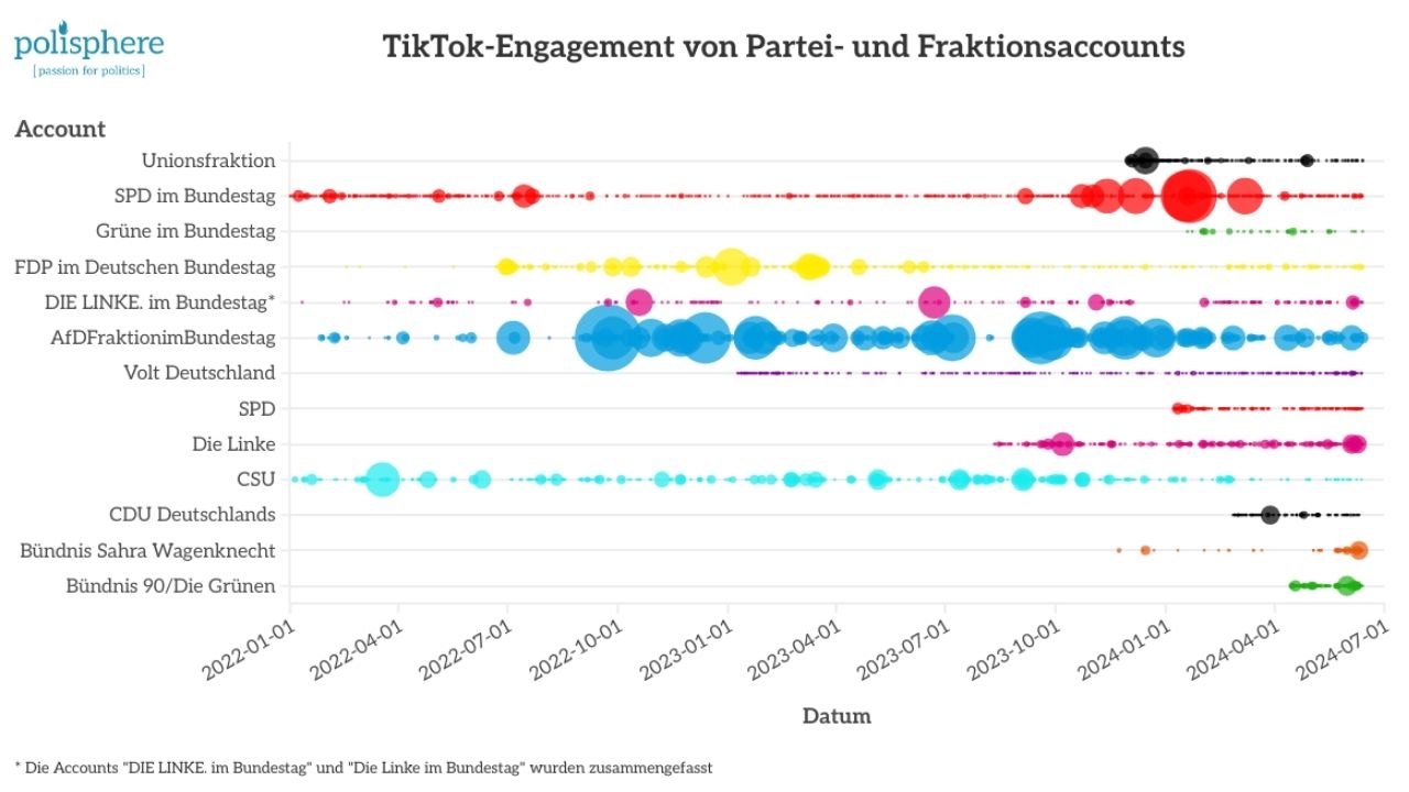 Die Friedrich-Ebert-Stiftung hat ebenfalls eine Analyse der Europawahl (öffnet in neuem Tab) in Deutschland vorgelegt, bei der Social Media aber nur ein Teilaspekt ist. Auch hier steht TikTok im Mittelpunkt, das sich als zentrale Wahlkampf-Plattform für junge Wähler:innen etabliert und wo die AfD als “First Mover” immer noch einen Wettbewerbsvorteil habe. Die anderen Parteien hätten zwar nachgezogen, müssten aber noch einiges aufholen. Die gerade beschriebene Studie des IW wird ebenso erwähnt – unter anderem mit dem Hinweis, dass sich der TikTok-Erfolg von FDP und Strack-Zimmermann jedoch nicht in Jungwähler:innen-Stimmen für die Partei niedergeschlagen habe. Die Zugewinne für die AfD werden dagegen “in Teilen auf eine erfolgreiche Social-Media-Strategie” zurückgeführt, während die Stimmengewinne und -verluste der anderen etablierten Parteien mit Themenkonjunkturen verknüpft werden.