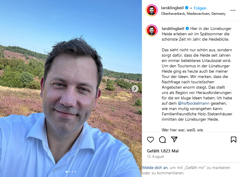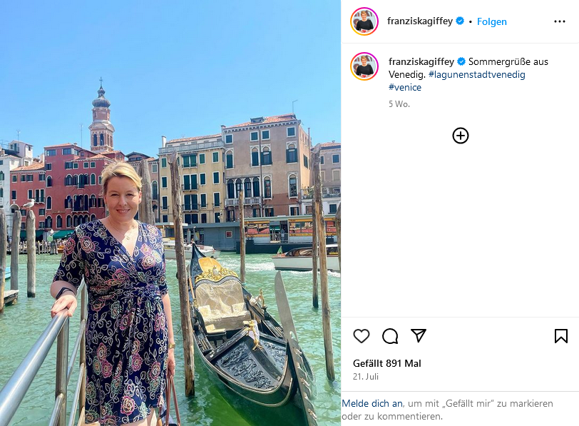 Weitere Politprominenz war dagegen mitteilungsfreudiger: SPD-Chef Lars Klingbeil (öffnet in neuem Tab) tankte Energie in der Lüneburger Heide, seine Kollegin von den Grünen, Ricarda Lang (öffnet in neuem Tab), sendete Grüße aus ihren Flitterwochen, während Franziska Giffey (öffnet in neuem Tab) durch Venedig gondelte. CDU-Bundesschatzmeisterin Julia Klöckner (öffnet in neuem Tab) war lieber in der Heimat unterwegs. Grünen Co-Chef Omid Nouripour (öffnet in neuem Tab) tat sich mit Tipps für die Urlaubslektüre hervor. Und BSW-Mitgründerin Amira Mohamed Ali (öffnet in neuem Tab) nutzte die freie Zeit für ein Konzertbesuch bei ACDC in Hannover.