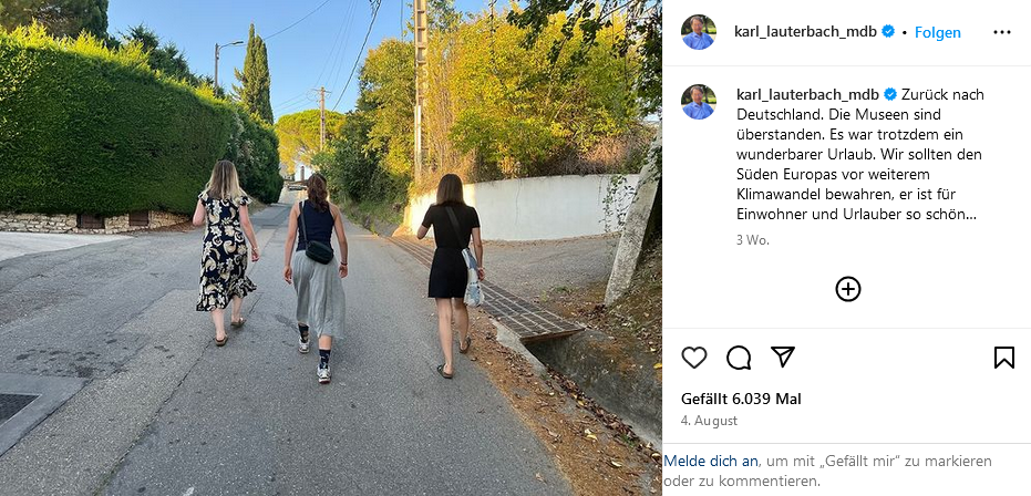 Auffällig ist dabei, dass viele – gerade jüngere – Bundestagsabgeordnete Urlaubsbilder posten, auf denen auch ihre Partner:innen oder Kinder zu sehen sind. Dazu gehören beispielsweise Johannes Vogel (öffnet in neuem Tab) (Parlamentarischer Geschäftsführer der FDP-Bundestagsfraktion), der in den USA unterwegs war, SPD-MdB Jessica Rosenthal (öffnet in neuem Tab), ihre Fraktionskollegen Johannes Arlt (öffnet in neuem Tab) in Schweden und Robin Mesarosch (öffnet in neuem Tab) in den Dolomiten, Felix Banaszak (öffnet in neuem Tab) (Grüne) am Meer oder Jan-Niclas Gesenhues (öffnet in neuem Tab), Parlamentarischer Staatssekretär im Bundesministerium für Umwelt, den es nach Portugal verschlagen hat.
