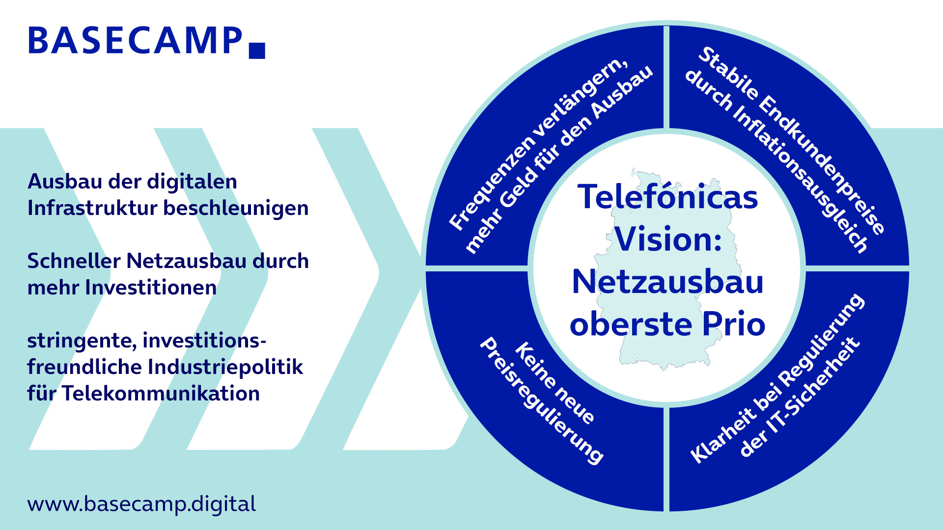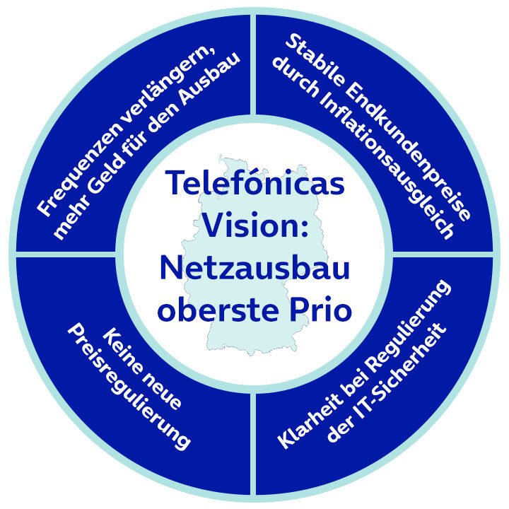 Der neuen Regierungskoalition bietet sich die Chance, die notwendigen Weichen zu stellen, damit die privatwirtschaftlichen Investitionen in den Ausbau der digitalen Infrastruktur Deutschlands deutlich steigen. Flächendeckende Mobilfunknetze auch in ländlichen Regionen und Glasfaseranschlüsse für alle Haushalte sind nur durch deutlich steigende Investitionen möglich. Damit das gelingt, braucht es eine konsistente Industriepolitik für Telekommunikation, die den Infrastrukturausbau forciert vorantreibt. Telefónica hat sich daher mit folgenden Vorschlägen an die neuen Koalitionäre gewandt: