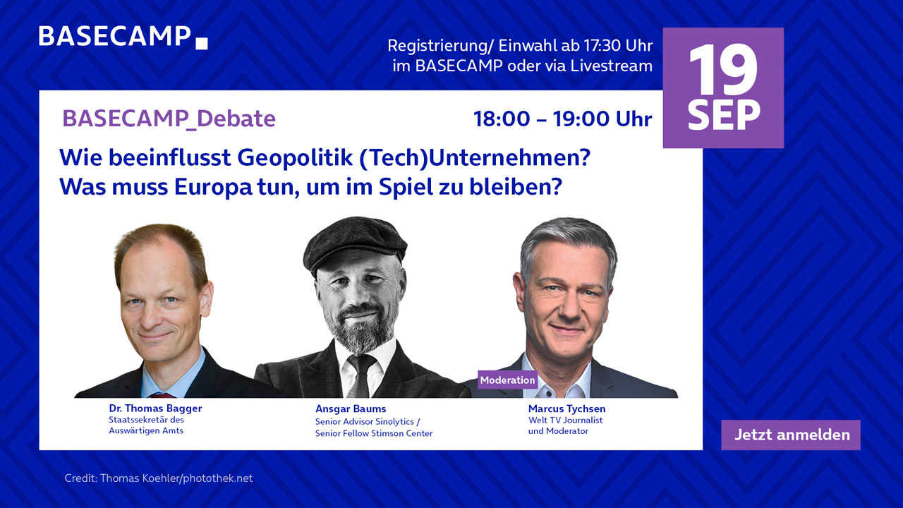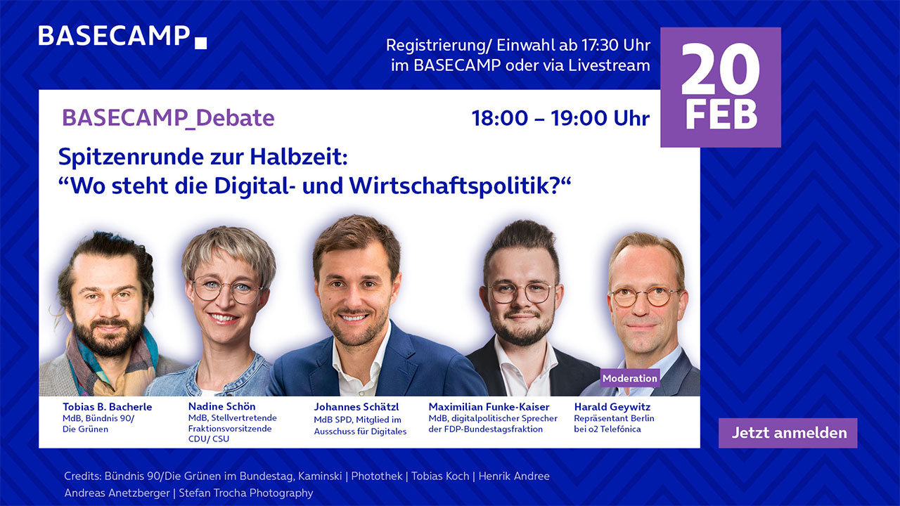 Bei den BASECAMP_Debates geht es hitzig zu. Wir debattieren und diskutieren auf der BASECAMP Bühne mit den Experten aus der Politik, Wirtschaft und Wissenschaft. Hier kommen Meinungsführer zusammen, um gesellschaftliche und politische Auswirkungen der Digitalisierung von verschiedenen Seiten zu beleuchten, zu analysieren und manchmal auch zu polarisieren. Auch unsere Gäste kommen wie gewohnt zu Wort.