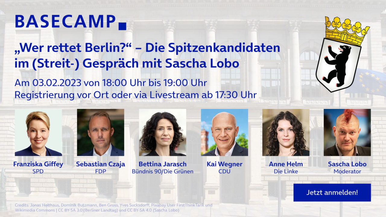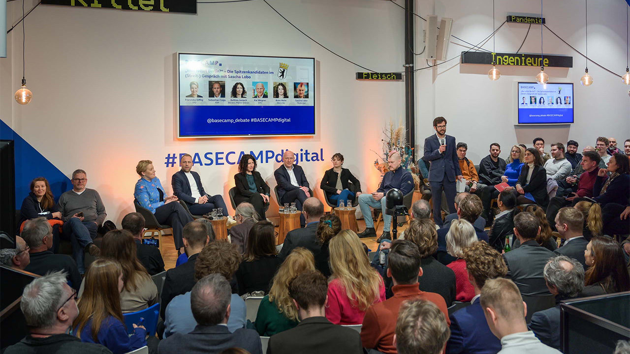 03. Feb. 2023 EVENT BASECAMP_Debate: „Wer rettet Berlin?“ – Die Spitzenkandidaten im (Streit-) Gespräch mit Sascha Lobo