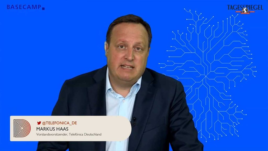 Grundvoraussetzung für die weitere Digitalisierung, so Casdorff, sei eine leistungsfähige Infrastruktur. Markus Haas stimmte dem zu und erklärte: „Die digitale Infrastruktur ist deutlich besser als ihr Ruf, das haben wir in der Corona-Krise gemerkt“. Auch mit Blick in die Zukunft zeigte sich der Vorstandvorsitzende von Telefónica optimistisch. Der Ausbau bei 5G gelinge viel schneller als bei früheren Netzen. Es brauche die Akzeptanz in der Bevölkerung, „aber wir sind gut unterwegs“. Durch die Zusage, dass Frequenzen künftig nicht versteigert, sondern verlängert werden, könnten die Unternehmen kontinuierlicher planen und Förderprogramme könnten effizienter gestaltet werden. „Wir müssen Weltspitze werden bei 5G“, erklärte Markus Haas, denn das brauche die Produktion ebenso wie das Klima. „Wir sind das Trampolin“, unterstrich er die Bedeutung der digitalen Infrastrukturunternehmen, „je besser unser Netz ist, desto höher können alle springen“.