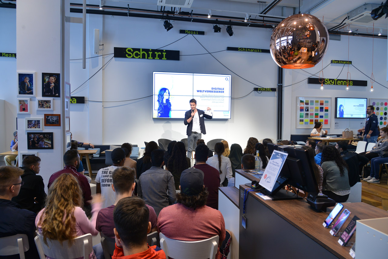 Zum Thema „Mit digitalen Medien die Welt verändern“ wurde bei der anschließenden Podiumsrunde im Basecamp mit rund 90 Schülern diskutiert, welche Tools Jugendliche benötigen, damit sie die Welt mitgestalten können und wie welche Unterstützung sie von Politik und Unternehmen benötigen. Bettina Bundszus (Abteilungsleiterin „Kinder und Jugend“ des Bundesministeriums für Familie, Senioren, Frauen und Jugend), Politikjournalist und Gründer der Online Sendung Jung & Naiv Tilo Jung, Valentina Daiber (Director Corporate Affairs, Telefónica Deutschland) und Daniel Bayer (Projektmacher bei Think Big) standen den jungen Weltverbesserern Rede und Antwort.