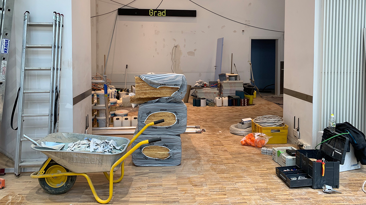 An der Türklinke zum Eingang hängen Arbeitsstiefel mit glänzenden Stahlkappen. Fußabdrücke im Staub auf dem Boden zeichnen die Laufwege der vergangenen Tage nach. Fast überall riecht es nach Leim und frischen Sägespänen. Die Schleifmaschine kreischt, wenn sie in endlosen geraden Linien über den Holzboden kriecht. Nur mit Mühe lässt sich ein Weg zwischen Farbeimern, Werkzeugkisten und Gerüsten bahnen. Bloß nicht über die Schubkarre stolpern!