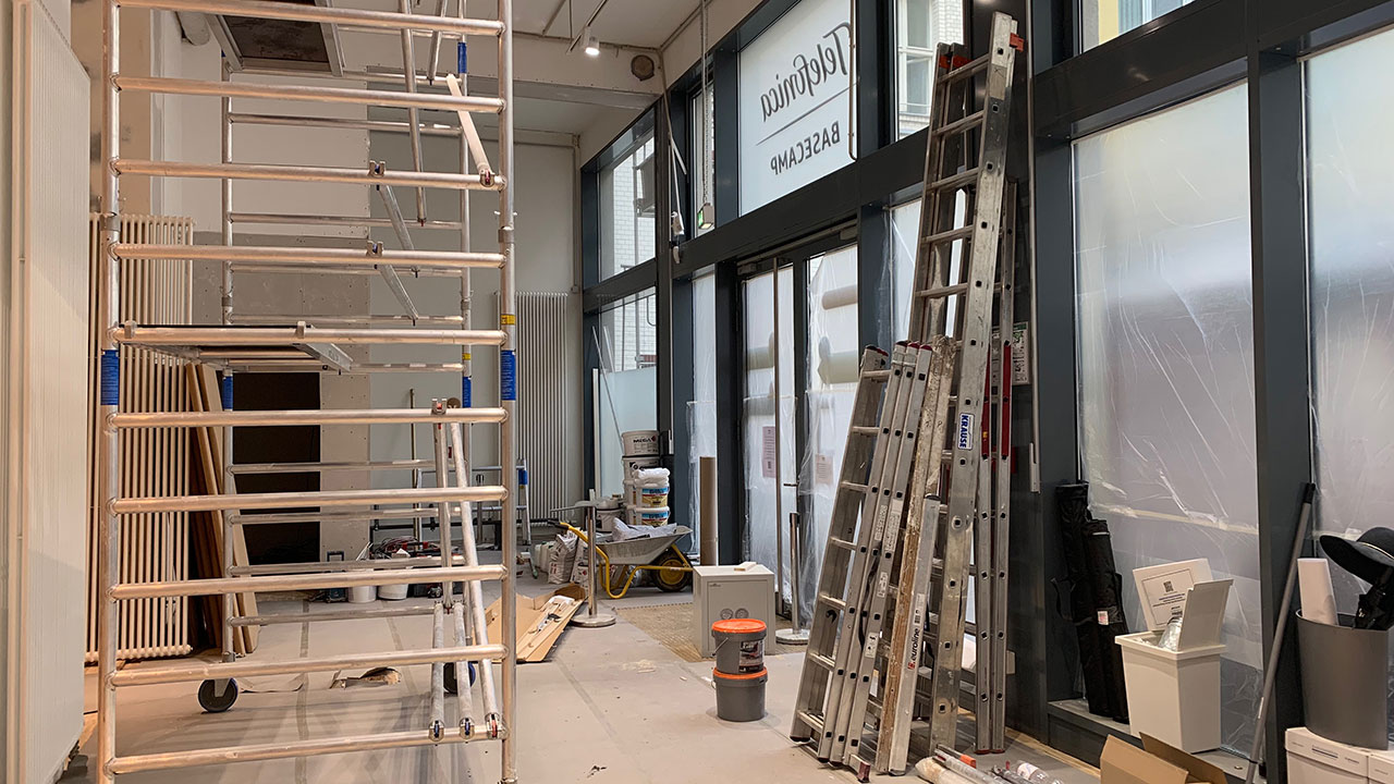 Wer in diesen Tagen beim Telefónica BASECAMP durch die Fenster schaut, der wird es kaum wiedererkennen. Mehr als ein Blick durch die Schlitze im Sichtschutz ist auch gar nicht möglich, denn es gilt: „Zutritt für Unbefugte verboten“. Noch bis zum 18. August wird unser Veranstaltungsort mit Coworking Space, Café und O2 Shop umgebaut. Wir haben viel Neues vor, doch das wird heute noch nicht verraten. Dafür erlauben wir einen Blick hinter die Kulissen, wo das neue BASECAMP entsteht.