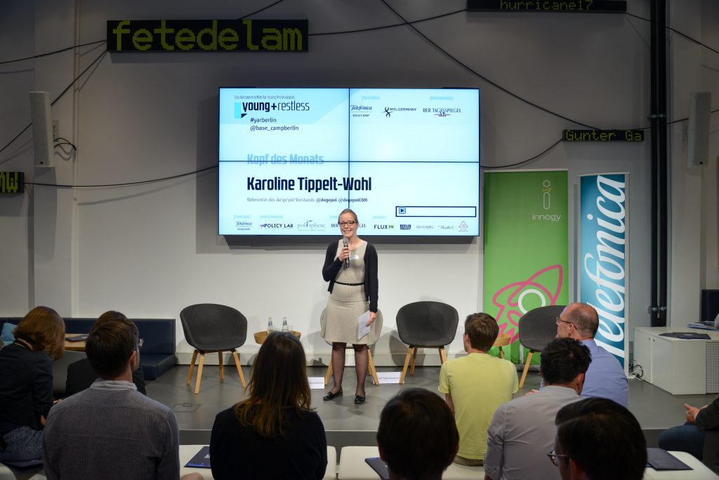 young+restless zeichnet sich dadurch aus, dass die Zuhörer mit Referenten und Experten diskutieren und netzwerken können, was auch dieses Mal an den sieben Thementischen zu angeregten Gesprächen führte. An dem Abend wurde zudem Karoline Tippelt-Wohl von der Deutschen Gesellschaft für Politikberatung e.V. (de’ge’pol) als Kopf des Monats ausgezeichnet.